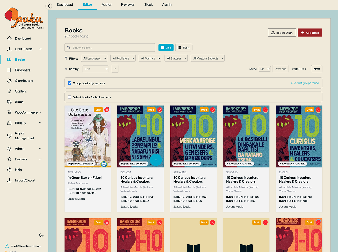 Puku.co.za (launching soon!) brings together children's books from multiple publishers in 11 official South African languages. OnixFeed is the backbone of that catalogue: a single place where each publisher keeps their data valid and ONIX-compliant to PASA standards—so the whole ecosystem stays consistent and ready for distribution.