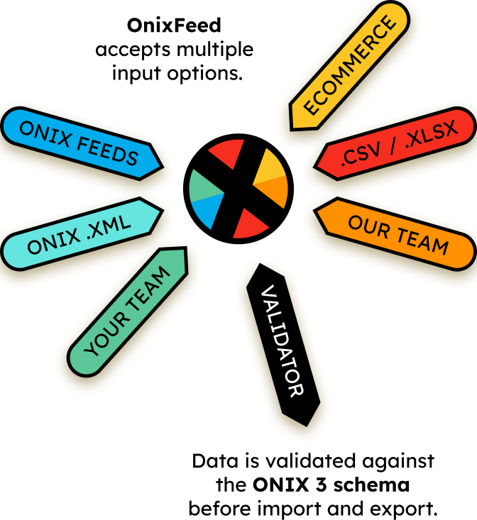 OnixFeed can import existing ONIX .XML 2 and 3 data in feed or file format . We are also able to import .CSV and .XLSX files formatted to our import specification. Data is converted to valid XML before import.
